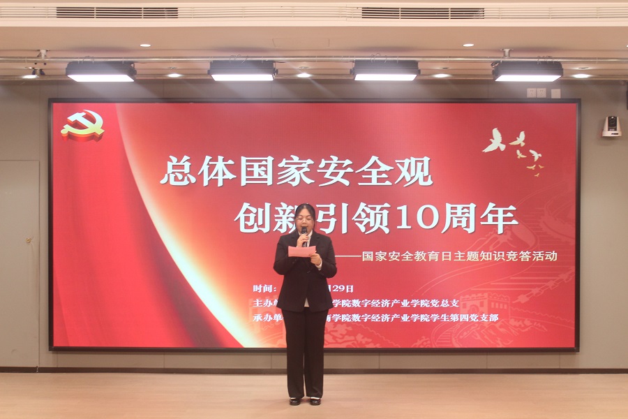 为进一步贯彻落实总体国家安全观,强化师生对国家安全的认识,自觉践行总体国家安全观,共同维护国家安全和稳定。数字经济产业学院学生第四党支部于4月29日晚在第八教学楼202举行了“总体国家安全观,创新引领10周年”——国家安全教育日主题知识竞答活动。出席本次活动的嘉宾有数字经济产业学院学生第三党支部书记王政、学生第四党支部书记杨丹铭、学生第四党支部副书记陈雅玲、学生第一党支部组织委员杨应涛及教师党员翁佳霖。