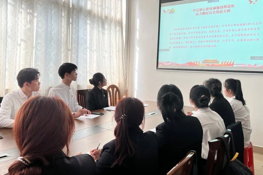 会前,袁小蕾带领支部党员学习习近平总书记在2024年春季学期中央党校(国家行政学院)中青年干部培训班开班之际作出重要指示精神,她强调,要自觉做党的创新理论的笃信笃行者,坚持不懈用习近平新时代中国特色社会主义思想凝心铸魂,不断筑牢信仰之基、补足精神之钙、把稳思想之舵,切实提升马克思主义理论水平和运用能力。党员们纷纷表示,作为青年要把握好学习的主动性、创新性,要学好用好教材,当好中国式现代化建设的坚定行动派、实干家。