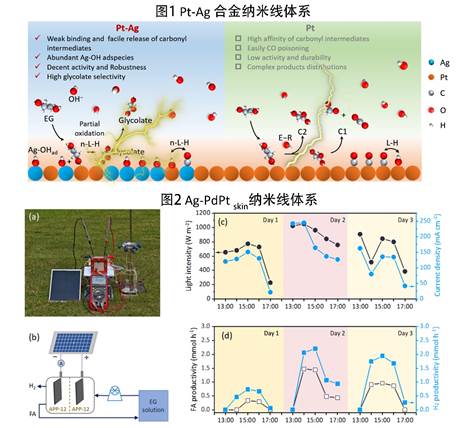 银(Ag)是室温下导电性最高的金属,适合作为电催化剂的辅助金属。然而,银在电氧化反应中并无催化活性,且较易氧化(0.7996 V vs. RHE),因此多数研究人员忽略了其在电催化氧化反应中的作用。在yl23455永利曹雪波研究团队的指导下,马佳敏等本科生携手杨颖等研究生开展研究,他们发现,Ag原子作为辅助金属,不仅通过传统配体效应优化催化中心Pt/Pd的电子结构,进而促进乙二醇的催化氧化,还借助原位电化学光谱学技术与理论计算揭示了Ag原子的另一重要作用:加速催化剂活化水分子,并产生羟基自由基(*OH),形成Ag-OH活性物种。Ag-OH活性物种能以一种更优的、非竞争性的Langmuir–Hinshelwood机制加速醇脱质子(图1),并快速释放氧化的碳基中间体,从而高选择性、高通量地得到目标产物乙醇酸与氢气,并能有效防止催化剂毒化,相关成果发表于中科院一区期刊上(Journal of Colloid and Interface Science 2025,684,197–206)。该研究小组还发现,在Ag-PdPtskin纳米线催化的乙二醇电氧化耦合制氢体系中,在>1.2 V电位下,会形成Ag2+。Ag活性物种能以非法拉第的模式直接氧化乙二醇与某些有毒中间体,从而提高催化剂的活性与抗中毒能力。在以粗乙二醇为原料的无膜电解制氢体系中,表现出超过3000小时的稳定性与工业级电流密度(>400 mA/cm2)(图2),相关成果发表于中科院一区期刊上(Advanced Functional Materials. 2024, 2418588)。以上研究受到国创项目(《银纳米线选择性电氧化醇耦合制氢》,马佳敏等人,指导老师黄林/曹雪波)、国家自然科学基金(no.22275074与22102063)与企业横向等课题的资助。