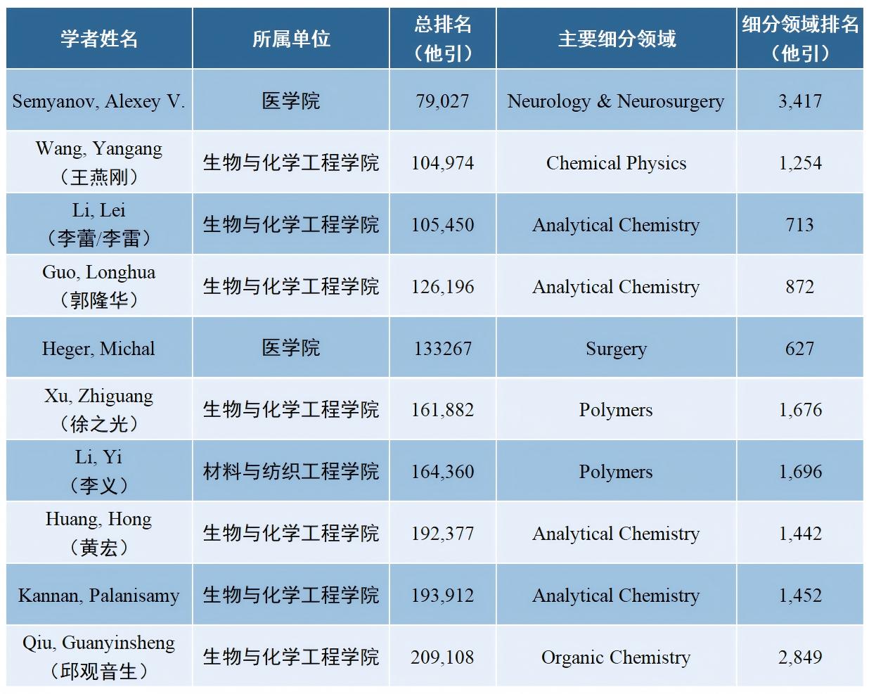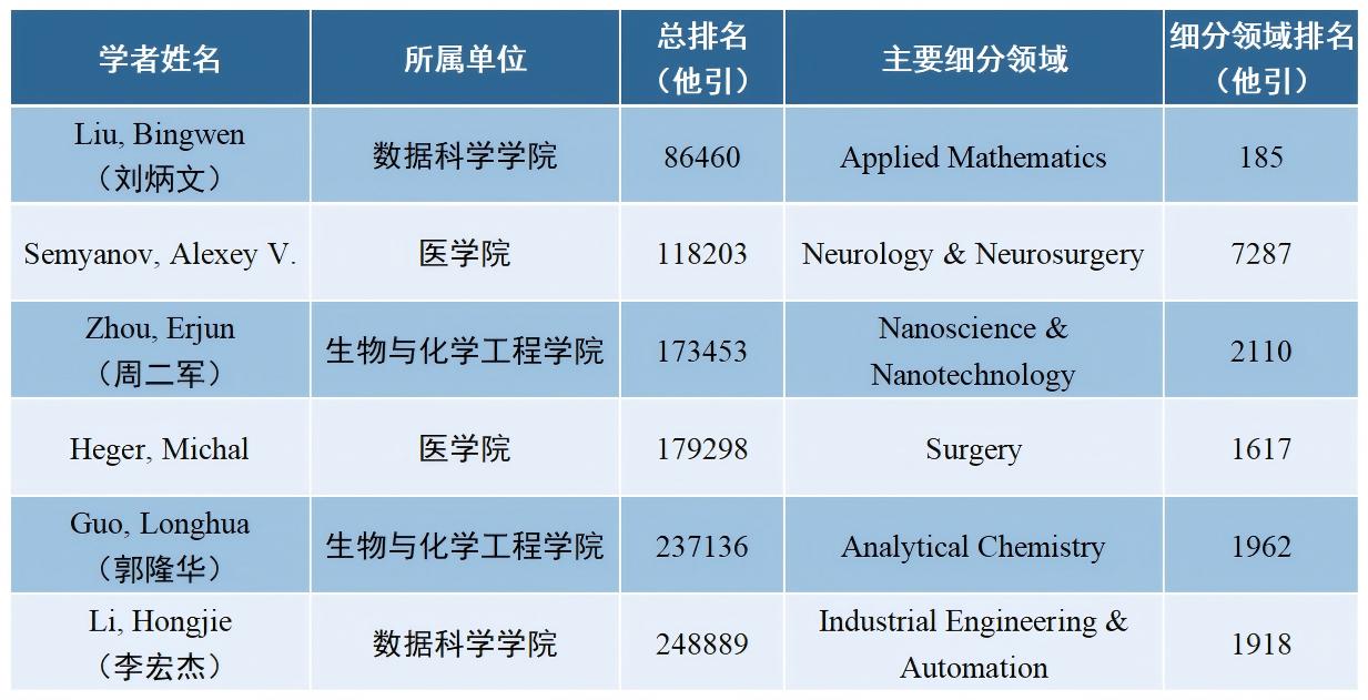 入选“终身科学影响力排行榜”的有:数据科学学院刘炳文、李宏杰,医学院Semyanov Alexey V.、Heger Michal,yl23455永利周二军、郭隆华。