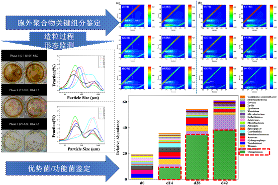 好氧颗粒污泥(AGS)技术由于其去除效率高、颗粒稳定,被誉为最具发展潜力的污水生物处理技术之一,但面对污水中抗生素含量增加、污泥处理负荷累积、污水处理厂处理效能下降的困境,好氧颗粒污泥技术急需突破在抗生素环境下快速成型和去除能效降低的技术瓶颈。本研究在广泛阅览前人研究的基础上,梯度加入较高浓度的四环素来模拟抗生素废水环境,20天就能观察到成型的污泥颗粒。本研究系统归纳好氧颗粒污泥技术面对四环素废水存在的不利因素和限制条件;深入梳理好氧颗粒污泥在四环素压力下的去除性能;发掘四环素压力下好氧颗粒污泥颗粒化条件及胞外聚合物特征,为工程应用提供理论依据和数据支撑,相关成果发表于中科院二区期刊上(Microorganisms. 2024, 12061173)。以上研究受到国创项目(耐盐好氧颗粒污泥生物强化体系的快速构建及四环素去除效能研究,娄弼宸等,指导教师欧栋/艾宁)、嘉兴市科技局项目(2024AD10041)与企业横向等课题的资助。
