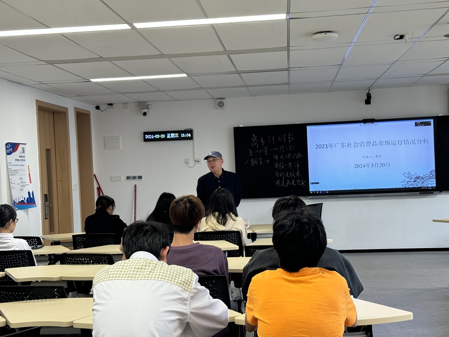 曹博士的分享题目为《2023 年广东社会消费品市场运行情况分析》,同时针对大学生职业规划与学生进行交流。曹博士分析了2023年广东消费品市场运行情况并指出,2023年,广东省深入贯彻落实中央经济工作会议“要把恢复和扩大消费摆在优先位置”的要求,把握疫情防控转段关键期积极出台促消费政策,消费增长新动能不断增强,推动消费市场规模稳步扩大,消费成为带动经济恢复增长的重要动力。同时曹博士进一步对2024年广东消费市场发展形势进行了预判,并提出了稳定居民预期提高居民收入、培育壮大新型消费不断创新消费场景、优化消费环境提振企业信心等相关建议。