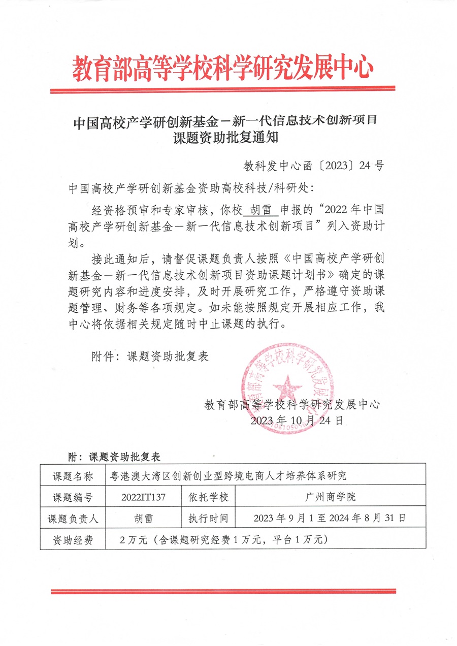近日,教育部高等学校科学研究发展中心发布了“2022年中国高校产学研创新基金-新一代信息技术创新项目”的资助通知,数字经济产业学院胡雷老师申报项目《粤港澳大湾区创新创业型跨境电商人才培养体系研究(2022IT137)》成功立项。