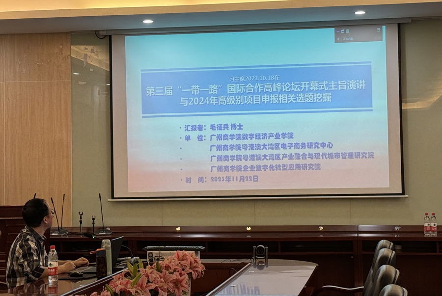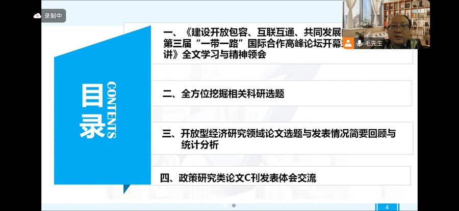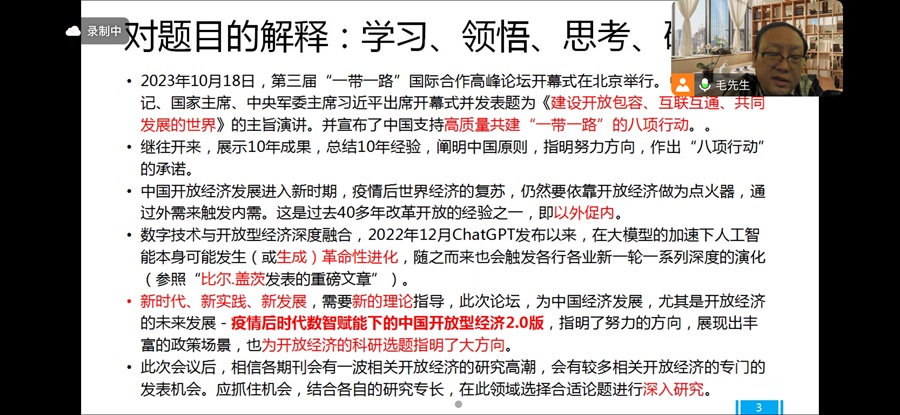毛博士的分享题目为《习近平主席2023.10.18在第三届“一带一路”国际合作高峰论坛开幕式主旨演讲与2024年高级别项目申报相关选题挖掘》,通过对《建设开放包容、互联互通、共同发展的世界——在第三届“一带一路”国际合作高峰论坛开幕式上的主旨演讲》进行全文学习,领会其精神,并从中挖掘科研选题,把握研究方向。毛博士对文件进行深度思考,挖掘出包括开放经济、国际合作、人工智能、鲁班工坊、民间交往等在内的三十个研究方向,为我院教师的高水平论文的写作发表以及高级别项目的申报提供了灵感来源。