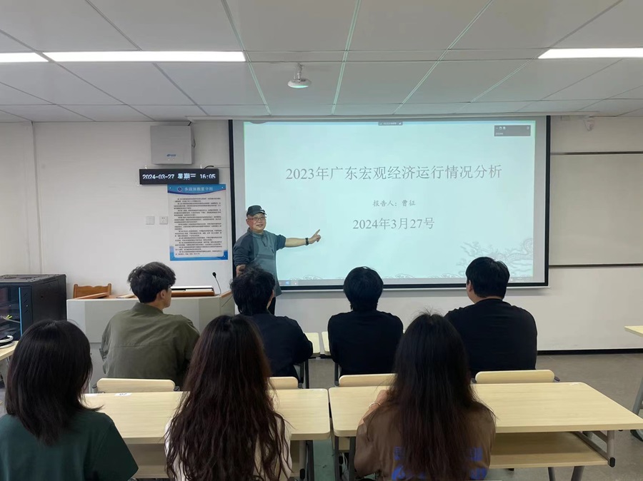 曹博士的分享题目为《2023年广东宏观经济运行情况分析》,同时针对大学生职业规划与学生进行交流。曹博士分析了2023年广东经济运行基本情况和主要特点。2023年,广东省以“再造一个新广东”的信心与决心,推动全省经济回升向好,经济总量在全国率先突破13万亿元,供给需求稳步改善,物价总体稳定,就业民生保障有力,高质量发展扎实推进,经济社会发展取得新成效。同时,曹博士进一步对2024年经济形势作出预判,并提出相关对策建议。一是激发消费潜能和扩大有效投资协同推进;二是进一步强化各类企业服务,落实好结构性减税降费政策;进一步提振信心,特别是民营企业增资扩产的信心,尽快扭转民间投资占比下滑态势。三是加快补齐短板,支持企业强化关键技术攻关,聚焦新产业、新模式,加快培育壮大新兴产业、未来产业;四是全力稳住外贸外资基本盘,以稳定的国际市场份额推动外贸结构优化升级,不断提高利用外资水平;五是以“百县千镇万村高质量发展工程”为重要抓手,发展壮大县域经济,奋力推进城乡区域协调发展。