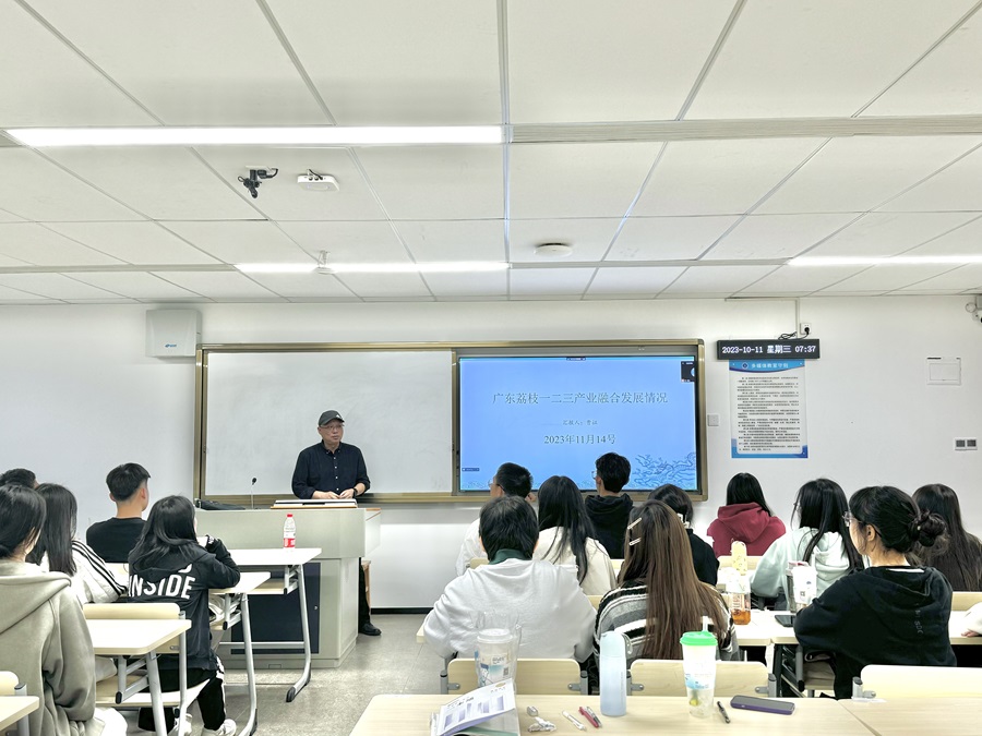 曹博士的分享题目为《广东荔枝一二三产业融合发展情况》,同时针对大学生职业规划与学生进行交流。曹博士以广东茂名为例,介绍了通过调查问卷、座谈交流、实地走访开展荔枝全产业链的调查情况。调研结果显示,荔枝是茂名特色水果,具有生产优势,在社会化服务、大数据和金融等多方面支持下,荔枝一二三产业融合初见成效,涉荔生产经营主体对荔枝产业发展有信心。同时,曹博士指出荔枝果园基础设施薄弱、生产成本持续上涨、加工业发展滞后等问题值得关注。