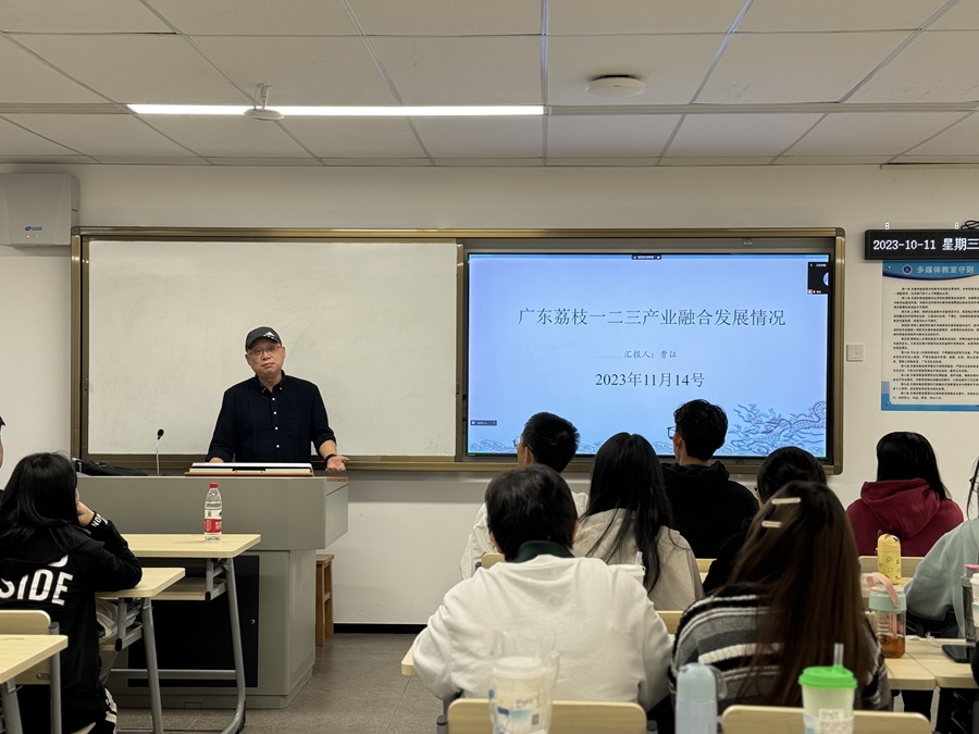 曹博士的分享题目为《广东荔枝一二三产业融合发展情况》,同时针对大学生职业规划与学生进行交流。曹博士以广东茂名为例,介绍了通过调查问卷、座谈交流、实地走访开展荔枝全产业链的调查情况。调研结果显示,荔枝是茂名特色水果,具有生产优势,在社会化服务、大数据和金融等多方面支持下,荔枝一二三产业融合初见成效,涉荔生产经营主体对荔枝产业发展有信心。同时,曹博士指出荔枝果园基础设施薄弱、生产成本持续上涨、加工业发展滞后等问题值得关注。