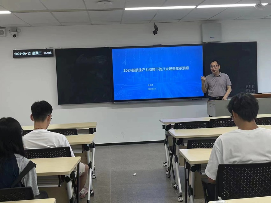 为促进学术交流,拓宽产业视野,6月12日下午15:30-17:30,我院在第八教学楼306教室举办了第二十八期学术沙龙。基于科技创新催生的产业新形态,进行主题为《2024新质生产力引领下的八大场景变革洞察》报告与分享。本期沙龙由肖勋勇博士主讲,共十余位师生参与了本次沙龙的活动。