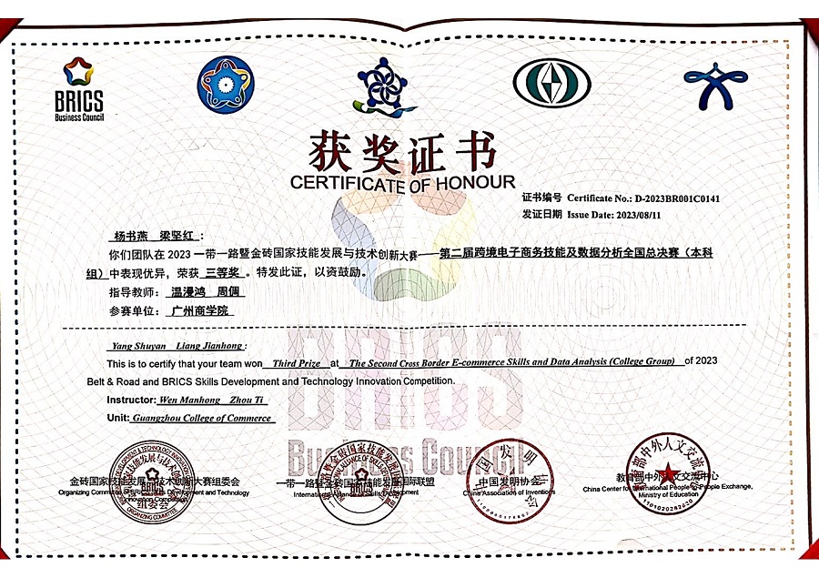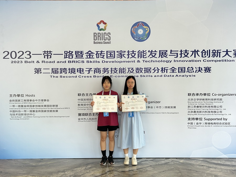 8月8日至11日,2023一带一路暨金砖国家技能发展与技术创新大赛之第二届跨境电子商务技能及数据分析赛项本科组全国总决赛在浙江金华举行。本次大赛由金砖国家工商理事会中方理事会、一带一路暨金砖国家技能发展国际联盟、中国科协一带一路暨金砖国家技能发展与技术创新培训中心、中国发明协会、教育部中外人文交流中心、金华市人民政府、浙江师范大学联合主办,金砖国家工商理事会(中方)技能发展工作组承办,北京企学研教育科技研究院、浙江思睿智训科技有限公司、北京嘉克兴科技有限公司联合承办,中国(金华)跨境电商综合试验区支持。经过连续两日的激烈角逐,由我院学生杨书燕、梁坚红组成的参赛团队在温漫鸿、周倜两位老师的指导下顺利通过数据分析及报告撰写环节晋级现场答辩赛,并最终获得三等奖的优异成绩。