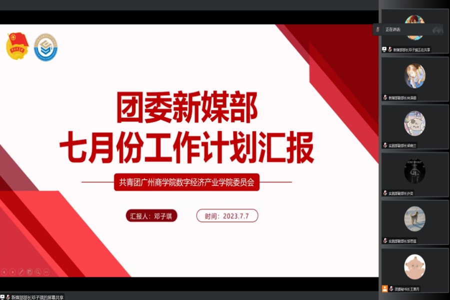 为深入学习贯彻习近平新时代中国特色社会主义思想,落实好团的十九大精神的学习宣传工作,增强骨干们的工作能力和综合素质,加强团委成员之间的了解程度,提高工作效率。数字经济产业学院团委于7月7日中午在腾讯会议召开“踔厉奋发新征程,勇毅前行谱新篇”学习贯彻团的十九大精神专题学习会暨团委七月工作例会。团委书记王政及数字经济产业学院团委全体成员参加本次会议。