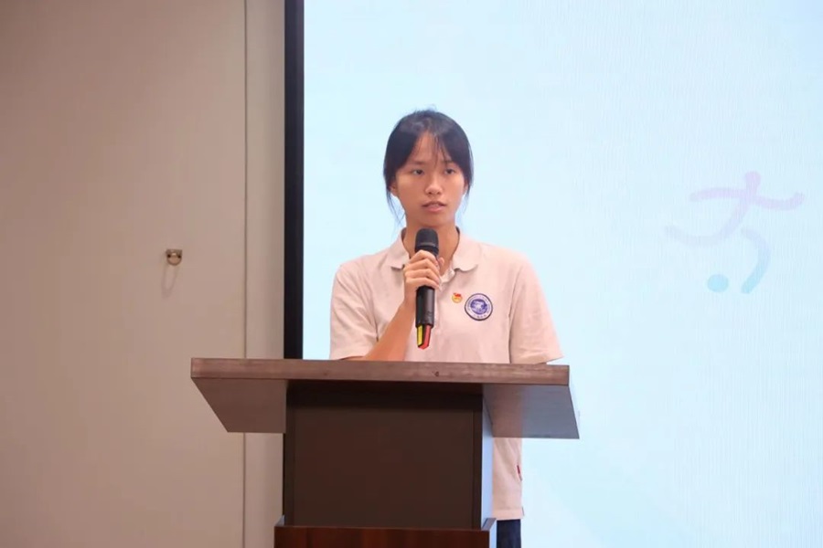运动员代表廖晓彤发言,她提到活力广商,体育先行。践行体育精神,开展体育活动,对培养新时代人才和学校发展建设起着至关重要的作用。廖晓彤代表全体运动员发出倡议:运动员们会积极参与训练,发扬体育精神,以青春昂扬之势,勇创体育佳绩。