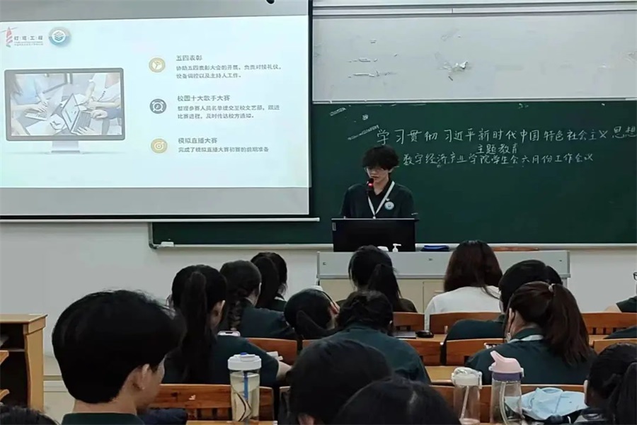 为深入理解习近平新时代中国特色社会主义思想、不断弘扬伟大斗争精神,数字经济产业学院学生会于6月6日中午在第四教学楼207开展集中学习贯彻习近平新时代中国特色社会主义思想主题教育暨学生会六月份工作会议,团委副书记、学生会指导老师杨丹铭及学生会全体成员出席本次会议。
