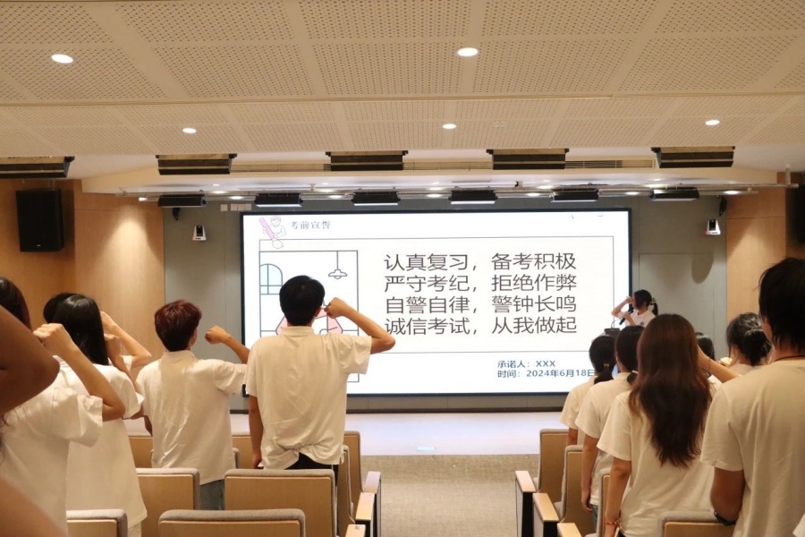 紧接着,朱靖媛为大家分享诚信考试教育的重要性,并介绍一系列实用的复习方法和技巧。她希望同学们要端正考试态度,严格遵守考风考纪,坚决抵制任何作弊行为。在朱靖媛同学的带领下,全体同学进行庄严的考前宣誓。