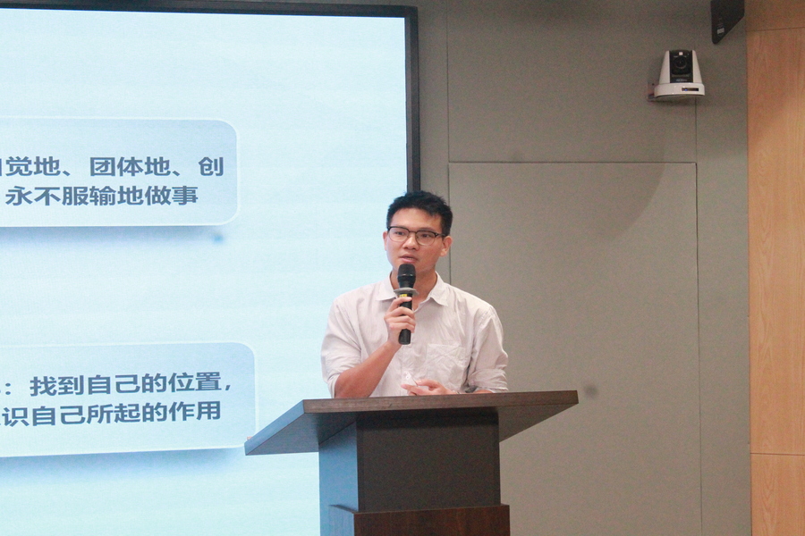 王政以“生而逢盛世,青年当有为”为题展开培训。他向团学成员们讲解了当代青年的样子、什么是学生骨干以及做学生骨干的意义,并提出了对学生骨干的工作要求,其中包括十种工作能力以及五项工作原则,此外,他还介绍了学生骨干的工作方法,强调“心有所信,方能致远;学有所悟,而后笃行”。继而,何杰安围绕“团学固定志愿者”、“融入团学”、“成长”三个关键词详细地向团学成员介绍了团学固定志愿者的身份,也为团学成员们更好地融入团学提出相关要求,并强调团学志愿者应秉持“从学生中来,到学生中去”的宗旨。