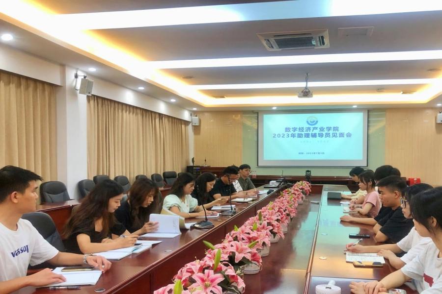 为迎接2023年新生的到来,进一步加强新一届助理辅导员对本职工作的认识,提高他们的工作积极性和工作效率,增强团队协作意识,培训一支有能力、有担当、有思想的助理辅导员队伍,更好地发挥助理辅导员的关键性作用。数字经济产业学院于7月3日中午在第二行政楼208举行了2023年新生助理辅导员培训大会暨见面会。出席本次会议的有数字经济产业学院党总支书记汪椿东,团委书记王政、团委副书记兼学生会指导老师杨丹铭,22级辅导员陈雅玲,新生辅导员杨红烨、袁小蕾、翁佳霖、杨应涛及全体新生助理辅导员。