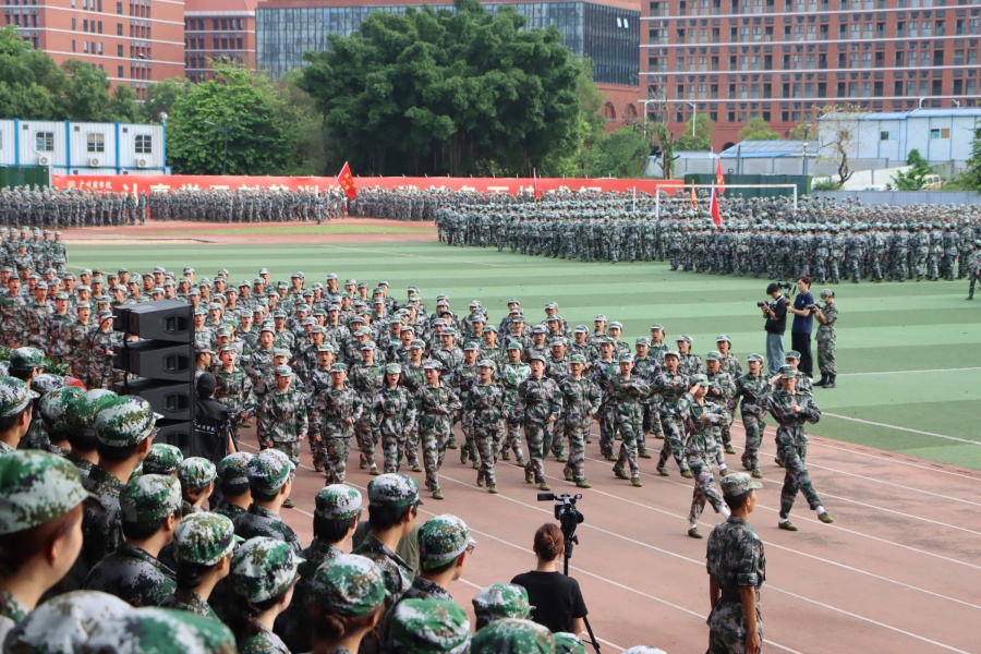 经过为期两周的严格军事训练,新生们于9月29号上午迎来了军训汇演,四营分列式的两个方阵,依次走过主席台接受检阅。旌旗飘扬,铁骨铮铮,整齐的脚步声、青春澎湃的口号声回荡在足球场上。擒敌拳汇演动作连贯,一招一式、动作精炼、英姿飒爽,构成了足球场上一道靓丽的风景线。