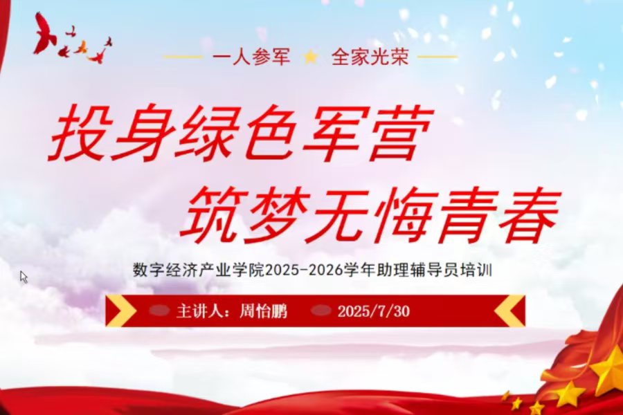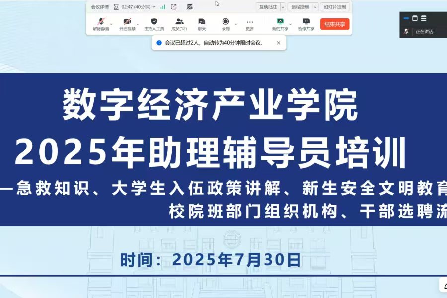 为全面提升助理辅导员的综合服务能力与应急素养,确保其能够更专业、更有效地引导新生适应校园生活,应对各类突发状况,我校数字经济产业学院于7月30日晚在腾讯会议开展“同舟引新渡,携手启新程”2025年新生助理辅导员系列培训会议。出席本次会议的有数字经济产业学院团委副书记、学生会指导老师何杰安、辅导员冯艺、辅导员李翠雯以及全体新生助理辅导员。