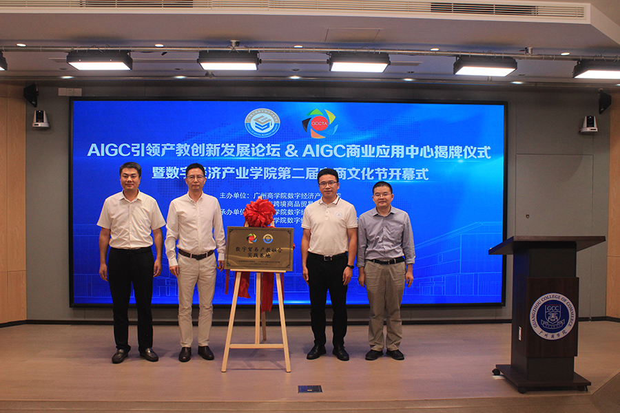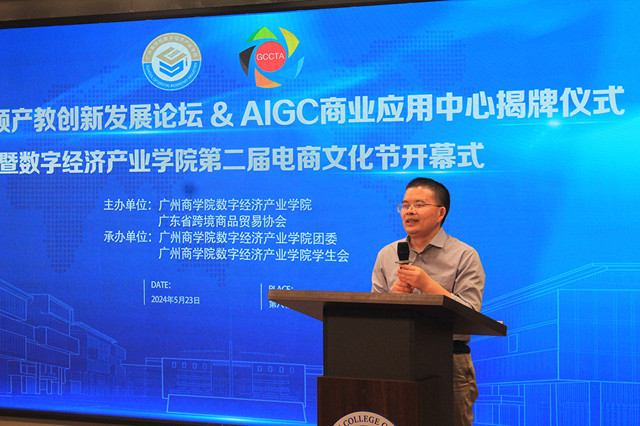 为全面贯彻党的二十大精神,深入学习贯彻习近平新时代中国特色社会主义思想,推进我校高质量应用型人才的培养,营造注重实践教育的文化氛围,提升学生的专业能力和实践能力。我校数字经济产业学院于5月23日在第八教学楼203教室开展AIGC引领产教创新发展论坛&AIGC商业应用中心揭牌仪式暨数字经济产业学院第二届电商文化节开幕式。莅临本次活动的嘉宾有:广东省跨境商品贸易协会执行会长王会明;广州红货科技有限服务公司商务总监刘如意;广东省跨境商品贸易协会AIGC商业技术服务中心副主任伍俊豪;杭州分叉智能科技有限公司市场总监肖文森;广州云友网络技术有限公司CEO李志伟:广东女子双创大赛主办方邱锐;粤贸协培训宣传助理黄泽纯;数字经济产业学院常务副院长舒光美、党总支书记汪椿东、电子商务教研室主任胡雷、大数据管理与应用教研室主任潘鹏、校企合作专员刘宇宏、团委书记王政、团委副书记、学生会指导老师何杰安,20级辅导员袁小蕾,22级辅导员陈雅玲,23级辅导员杨应涛,23级辅导员翁佳霖。