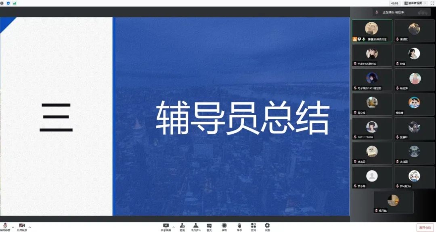 为进一步提升助理辅导员的业务水平,顺利统筹新生工作安排,广州商学院数字经济产业学院于8月4日晚上21:30在腾讯会议召开“夯实基础强素质,笃行不怠续新篇”第三场新生助理辅导员培训会议。参与本次培训会议的有2020级专升本辅导员王政,2022级辅导员杨丹铭、陈婕以及全体新生助理辅导员。